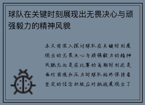 本文将深入探讨球队在关键时刻展现出的无畏...
