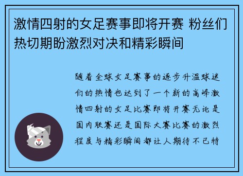 随着全球女足赛事的逐步升温,球迷们的热情...