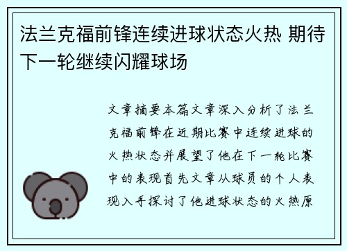 文章摘要:本篇文章深入分析了法兰克福前锋...