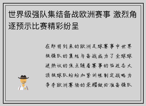 在即将到来的欧洲足球赛事中,世界级强队的...