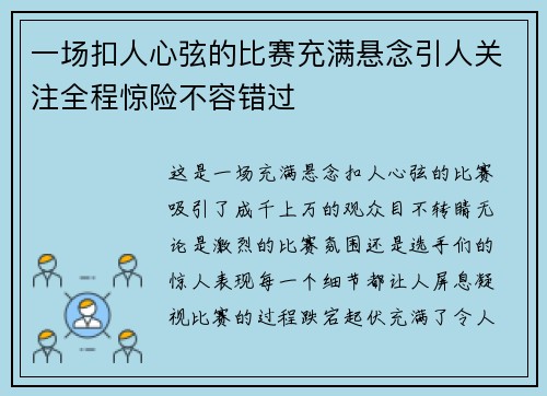 这是一场充满悬念、扣人心弦的比赛,吸引了...